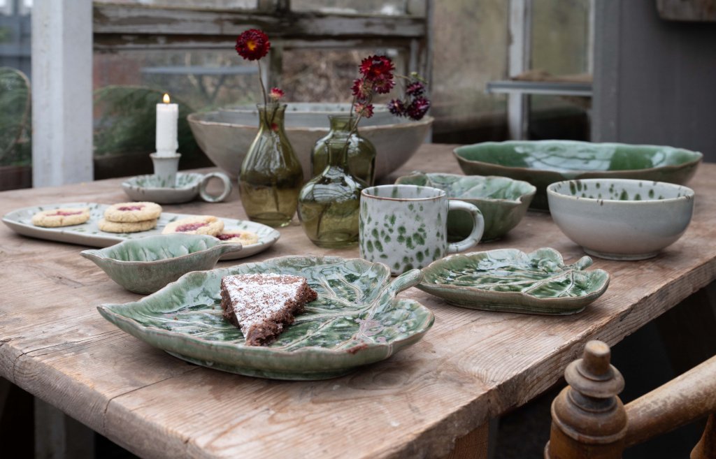 Lövformad skål i grönmelerat porslin, två storlekar att välja på.