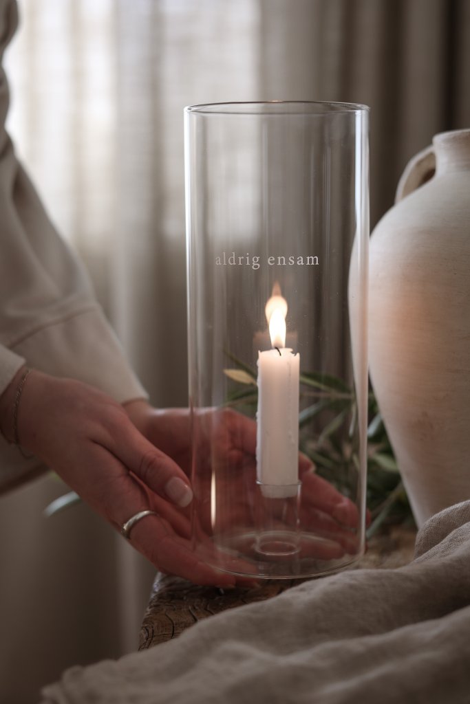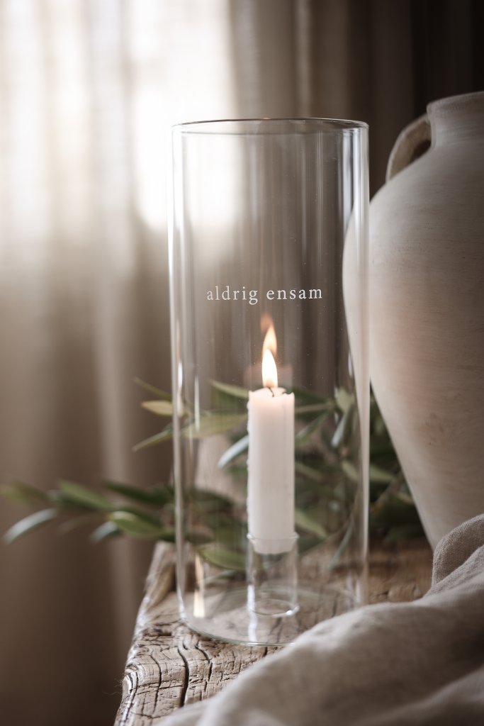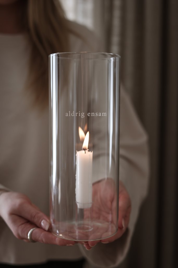 Stilren och vacker lykta i klarglas med viktigt budskap från Majas Cottage. Säljs med 10% förmån till organisationen ALDRIG ENSAM som verkar mot psykisk ohälsa.